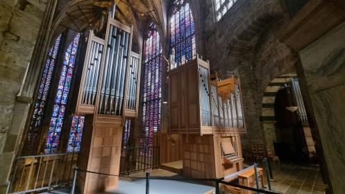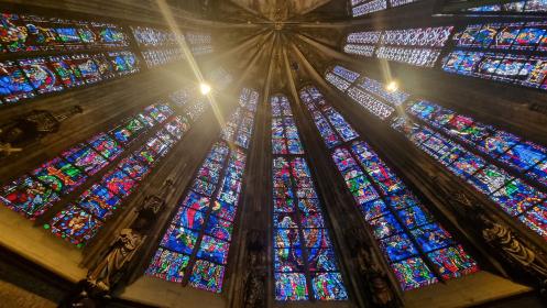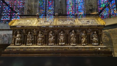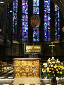 Nun betreten wir die Chorhalle, die nur für Führungen zugänglich ist. Vornehmlich während der Gotik wurde ein Kranz von Kapellen um den karolingischen Bau errichtet. Die größte dieser Kapellen ist die Chorhalle, die wegen ihrer mehr als 1000m² Glasfläche und rund 27 Meter hohen Fenster auch das „Glashaus von Aachen“ genannt wird. Hier trifft man auf ganz besondere Heiligtümer, das Pala d’oro, der Marienschrein, der Strahlenkranzmadonna und der Karlsschrein. Mit der Vollendung des Karlsschreins 1215 wurde der Höhepunkt der gefühlten und symbolisierten Anwesenheit des heiliggesprochenen Kaisers erreicht. Auch die vier großen Aachener Heiligtümer erhielten 1239 mit dem Marienschrein eine angemessene Aufbewahrung.