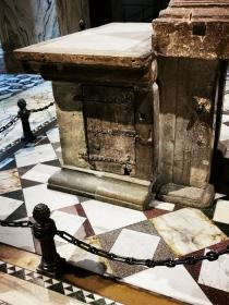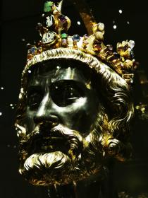 In der Domschatzkammer sind 130 außergewöhnliche Kunstwerke auf drei Etagen ausgestellt, die von der 1200-jährigen Geschichte des Aachener Domschatzes erzählen. Es sind Stücke, die nicht nur durch ihre handwerkliche Qualität oder Einzigartigkeit bestechen. Sie stellen in doppeltem Sinne wertvolle Zeugnisse dar für die Wertschätzung der Feier des Gottesdienstes und die Glaubensauffassung verschiedener Epochen. Den folgenden haben wir besondere Beachtung zugeteilt: Proserpinasarkophag, Lotharkreuz, Karlsbüste und den Schlössern des Marienschreins. Der heilige Karl. Mit dem Todestag Karls des Großen, dem 28. Januar 814, wird die Marienkirche zur Grabkirche des Kaisers. Am Abend seines Todes wird Karl im antik-römischen Proserpinasarkophag bestattet, der heute in der Domschatzkammer ausgestellt ist. Bald wird das Karlsgrab im südöstlichen Bereich des 16-Ecks der karolingischen Kirche Anziehungspunkt zahlreicher Herrscher, die sich auf Karl berufen.