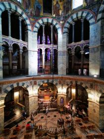 Zunächst betreten wir das karolingische Oktogon, diesen ließ Karl der Große gegen Ende des achten Jahrhunderts als Kern seiner Pfalzanlage errichten. Karl der Große ließ seine Marienkirche zu einem vollkommenen Abbild des Himmlischen Jerusalem werden, das die Berührung des Irdischen mit dem Himmlischen symbolisiert. Nach rund 20 Jahren Bauzeit fand sie um 803 ihre architektonische und liturgische Vollendung. Ihre Bedeutung speist sich aus einer über 1200-jährigen Geschichte: als Grablege Karls des Großen, als Krönungskirche der römisch-deutschen Könige und als Wallfahrtskirche, die alle sieben Jahre Gläubige aus der ganzen Welt anzieht.