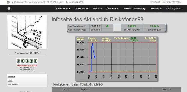 Klaus Dieter NiechciolAls erstes wurde unser Gesellschaftervertrag durchgesprochen, den Du auch auf unserer Website nachlesen kannst, falls Du einen Tipp für Deinen eigenen Aktienclub brauchst. Nachdem alle Punkte durchgesprochen waren und wir uns über alles einig waren, suchten wir einen Namen für unseren Aktienclub. Wie ihr an unserer Website erkennt könnt, haben wir uns für den Namen "Risikofonds98" entschieden.