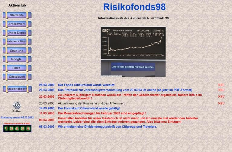 Endlich ist es soweit, der Risikofonds98 ist mit seiner ersten Website online. Alles in sehr viel Handarbeit, aber die Anfänge sind getan. Die Website hatte für uns viele Vorteile, weil vor allem die Abrechnungen jetzt online erschienen und nicht mehr per Post verschickt werden mussten.
