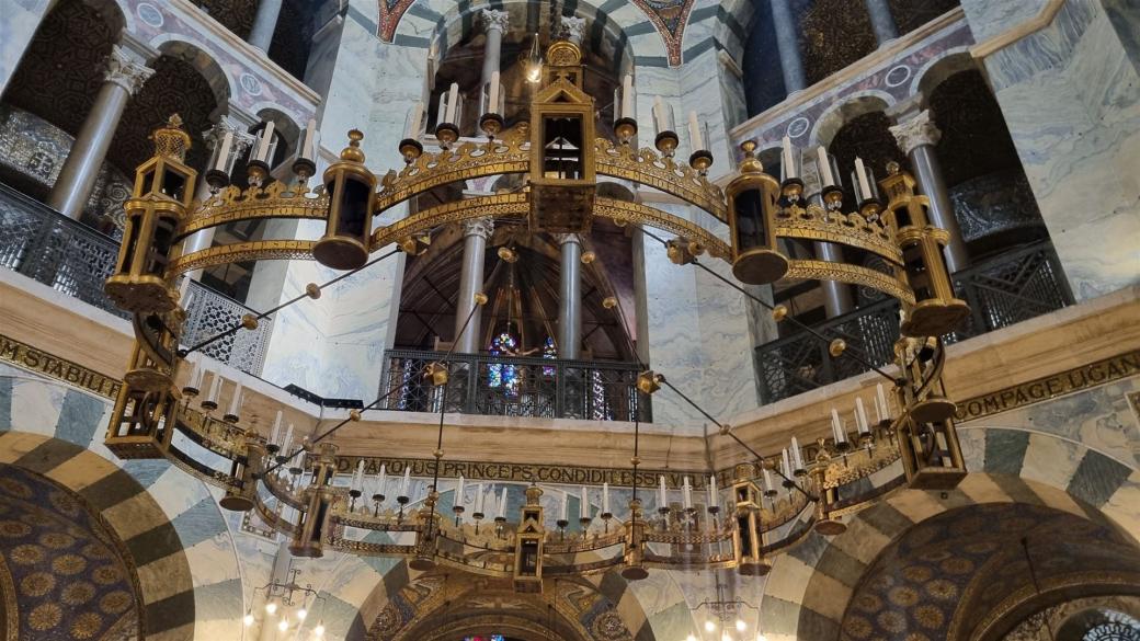 Zunächst betreten wir das karolingische Oktogon, diesen ließ Karl der Große gegen Ende des achten Jahrhunderts als Kern seiner Pfalzanlage errichten. Karl der Große ließ seine Marienkirche zu einem vollkommenen Abbild des Himmlischen Jerusalem werden, das die Berührung des Irdischen mit dem Himmlischen symbolisiert. Nach rund 20 Jahren Bauzeit fand sie um 803 ihre architektonische und liturgische Vollendung. Ihre Bedeutung speist sich aus einer über 1200-jährigen Geschichte: als Grablege Karls des Großen, als Krönungskirche der römisch-deutschen Könige und als Wallfahrtskirche, die alle sieben Jahre Gläubige aus der ganzen Welt anzieht.