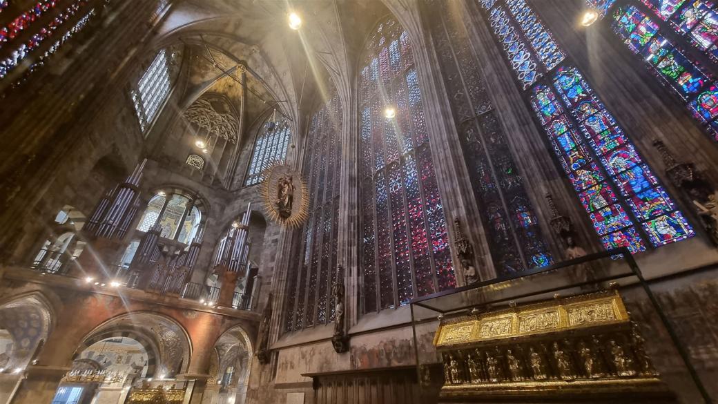 Nun betreten wir die Chorhalle, die nur für Führungen zugänglich ist. Vornehmlich während der Gotik wurde ein Kranz von Kapellen um den karolingischen Bau errichtet. Die größte dieser Kapellen ist die Chorhalle, die wegen ihrer mehr als 1000m² Glasfläche und rund 27 Meter hohen Fenster auch das „Glashaus von Aachen“ genannt wird. Hier trifft man auf ganz besondere Heiligtümer, das Pala d’oro, der Marienschrein, der Strahlenkranzmadonna und der Karlsschrein. Mit der Vollendung des Karlsschreins 1215 wurde der Höhepunkt der gefühlten und symbolisierten Anwesenheit des heiliggesprochenen Kaisers erreicht. Auch die vier großen Aachener Heiligtümer erhielten 1239 mit dem Marienschrein eine angemessene Aufbewahrung.