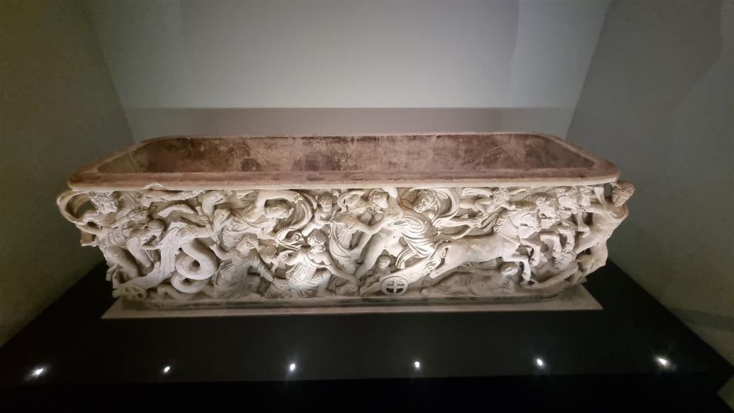In der Domschatzkammer sind 130 außergewöhnliche Kunstwerke auf drei Etagen ausgestellt, die von der 1200-jährigen Geschichte des Aachener Domschatzes erzählen. Es sind Stücke, die nicht nur durch ihre handwerkliche Qualität oder Einzigartigkeit bestechen. Sie stellen in doppeltem Sinne wertvolle Zeugnisse dar für die Wertschätzung der Feier des Gottesdienstes und die Glaubensauffassung verschiedener Epochen. Den folgenden haben wir besondere Beachtung zugeteilt: Proserpinasarkophag, Lotharkreuz, Karlsbüste und den Schlössern des Marienschreins. Der heilige Karl. Mit dem Todestag Karls des Großen, dem 28. Januar 814, wird die Marienkirche zur Grabkirche des Kaisers. Am Abend seines Todes wird Karl im antik-römischen Proserpinasarkophag bestattet, der heute in der Domschatzkammer ausgestellt ist. Bald wird das Karlsgrab im südöstlichen Bereich des 16-Ecks der karolingischen Kirche Anziehungspunkt zahlreicher Herrscher, die sich auf Karl berufen.